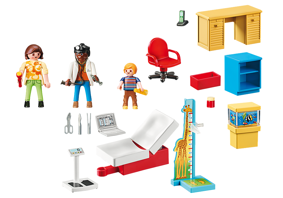 דמויות: רופא אחד, אישה אחת, ילד אחד אביזרים: ספת טיפול אחת, כיסא אחד, שולחן כתיבה, טלפון אחד, מחשב נייד אחד, פנס אחד, מנורת ראש אחת, סטטוסקופ אחד, קופסא אחת, מדף אחד, קופסא אחת, בקבוק אחד, אקווריום אחד, סט אחד של כלי ניתוח, קנה מידה אישי אחד, מוט מדידה אחד